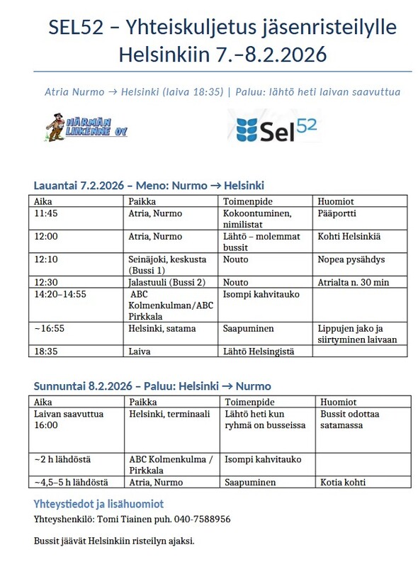 SEL:n suuri jäsenristeily 7.–8.2.2026 /ammattiosaston kuljetusaikataulu
